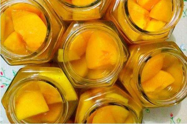 2、装黄桃的玻璃容器需选择耐高温的,否则在高温灭菌的过程中或将煮好的黄桃倒入容器中时容易发生炸裂的情况。