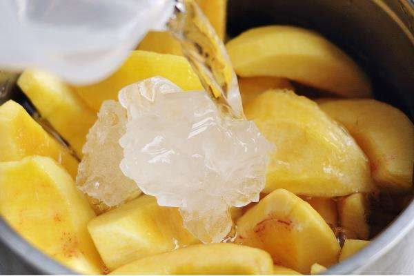3、在煮黄桃时,锅中水要没过黄桃,以便煮的更彻底。